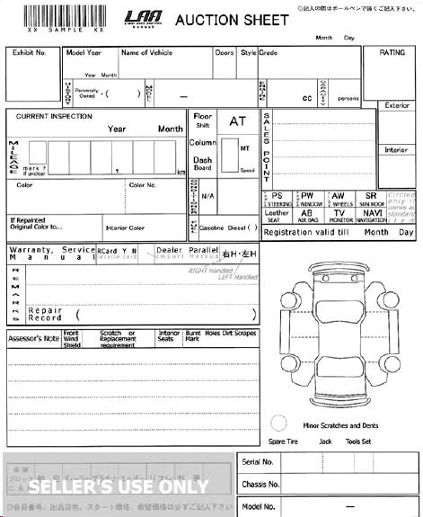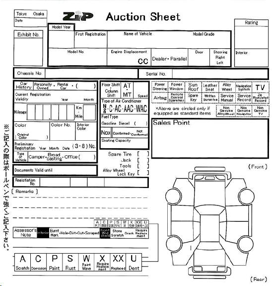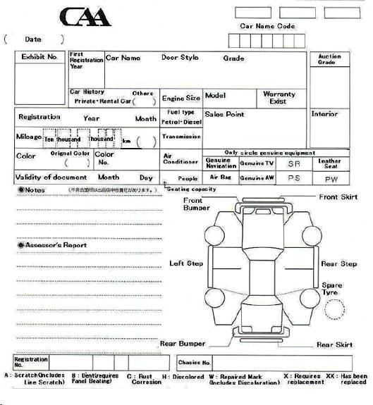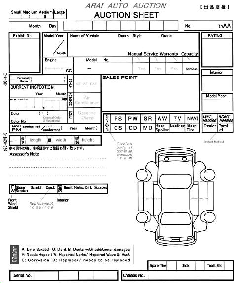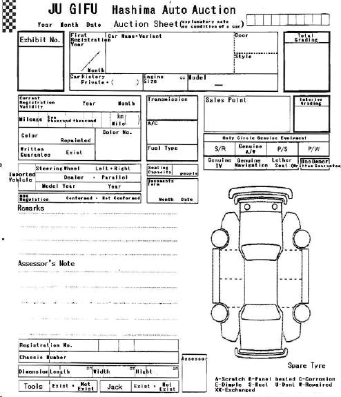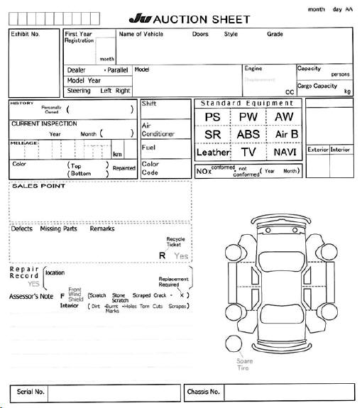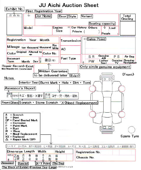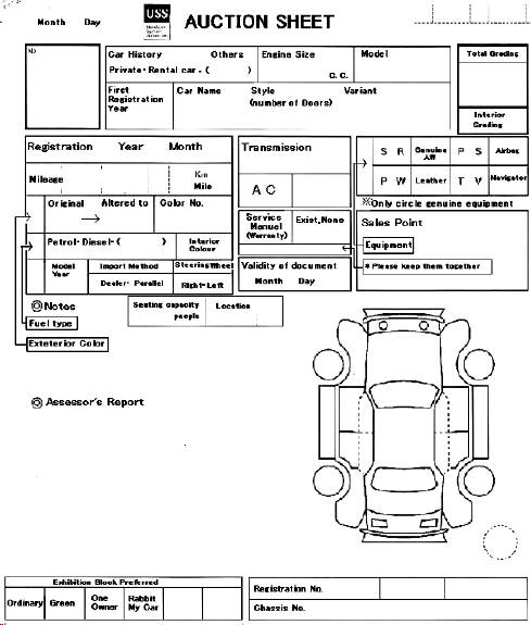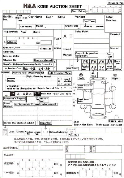 Below are examples of the auction sheets used by the main auction houses with the key areas translated into English.